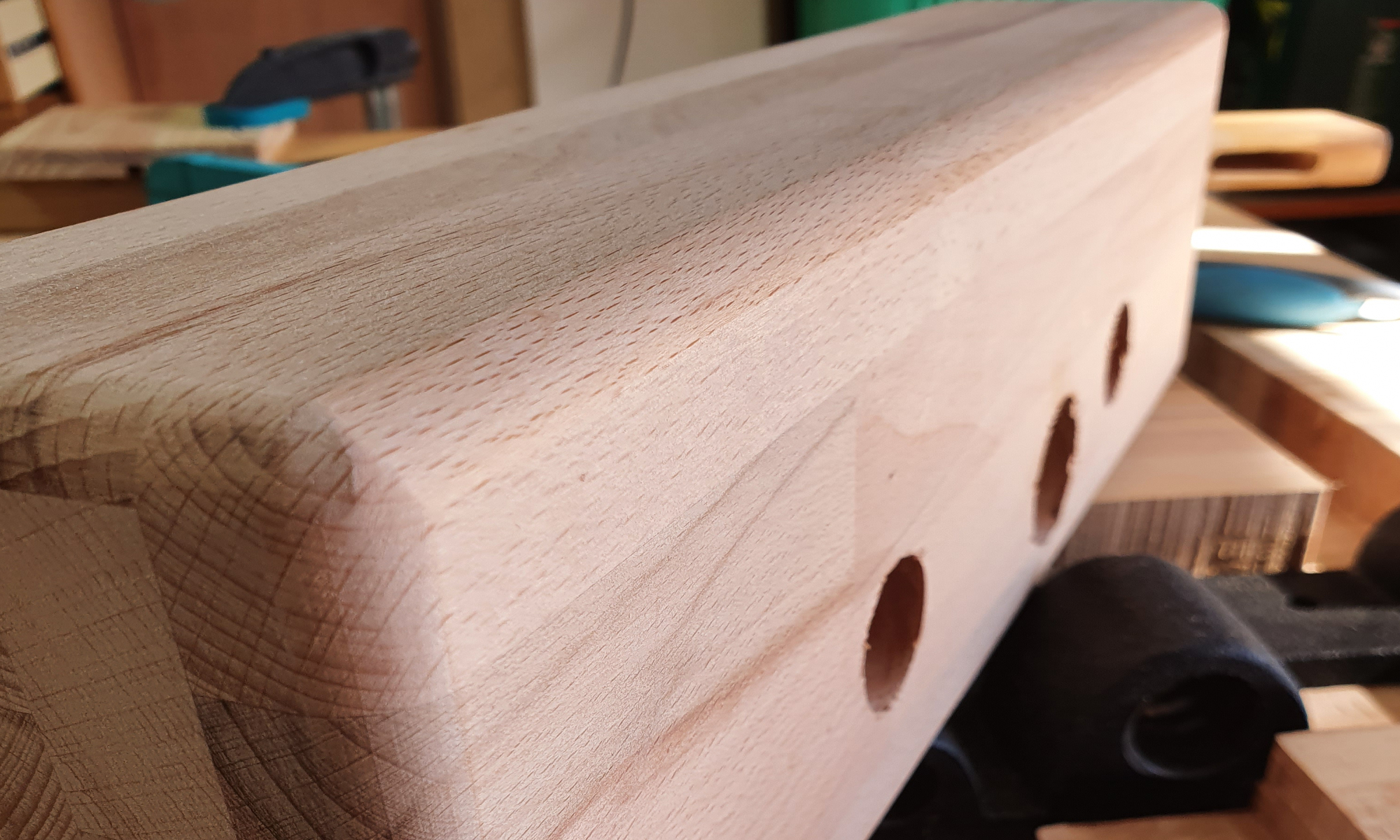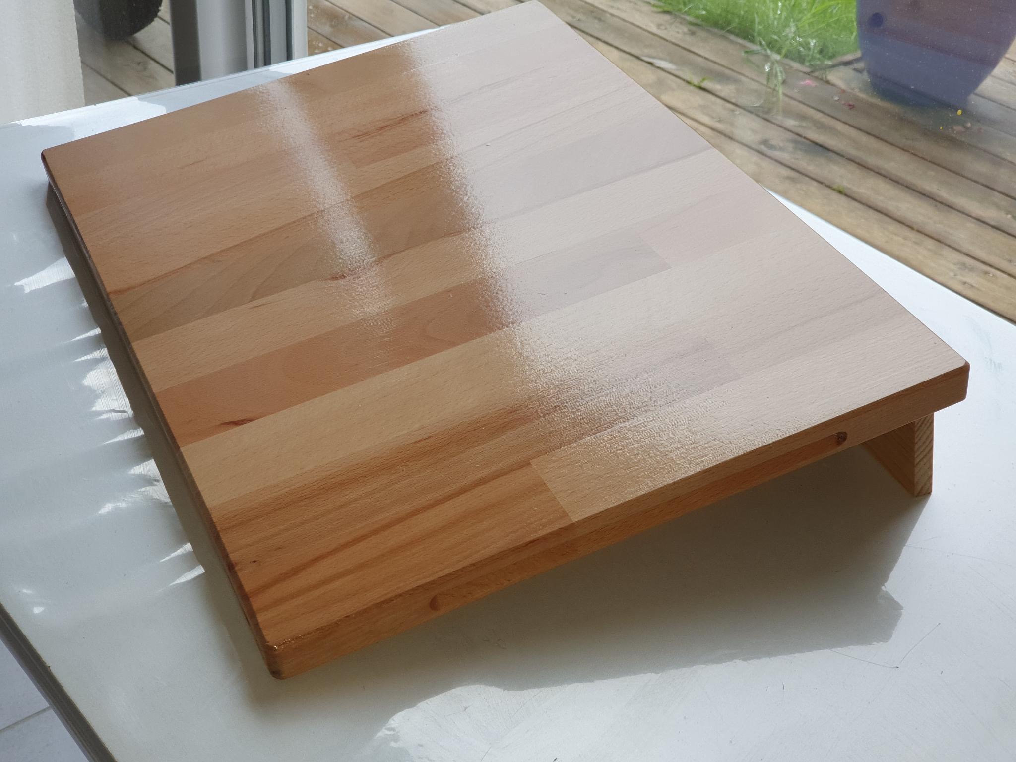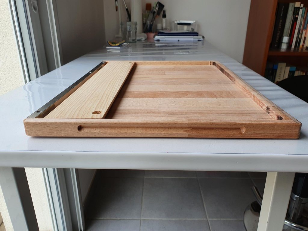 Réalisé à partir d’une planche de hêtre de 30cm x 40cm. Un bois dur assez dense évidée ensuite pour plus de légèreté.